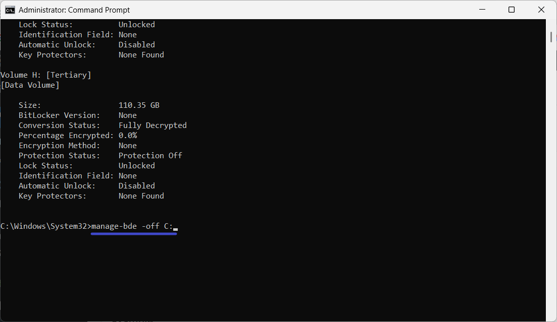 2. Kjør deretter følgende kommando for å deaktivere BitLocker: