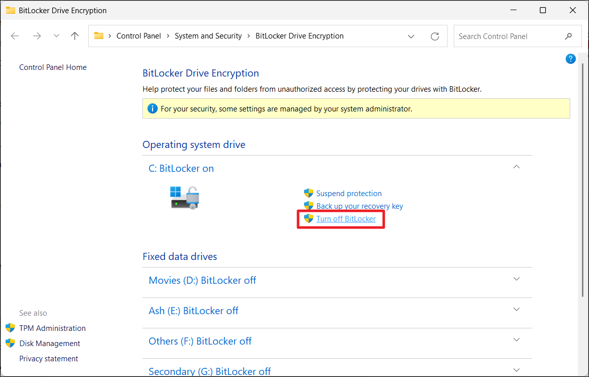 4. Klikk deretter på "Slå av BitLockeralternativet under den krypterte stasjonen.