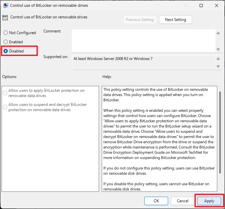 4. Velg "Funksjonshemmet" og klikk "Søke” for å forhindre BitLocker-aktivering på eksterne stasjoner.