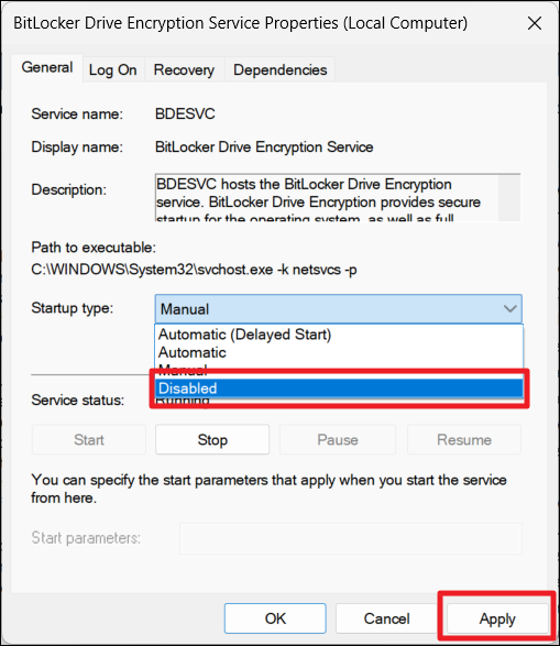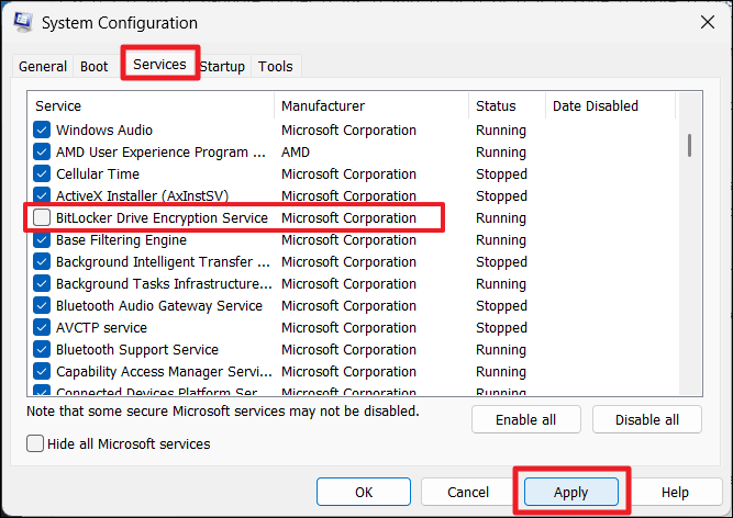 3. Finn og fjern merket for "BitLocker Drive Encryption Service" tjeneste og klikk "Søke“.