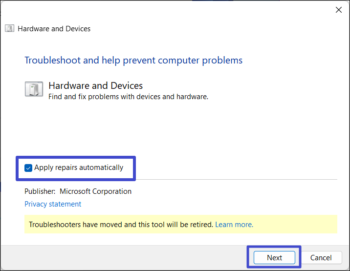 3. Sjekk "Påfør reparasjoner automatisk"-alternativet og klikk "Neste“.