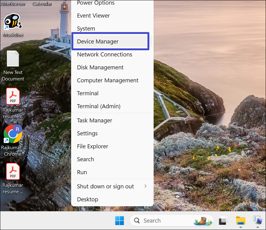 1. Høyreklikk på Start-menyen og velg "Enhetsbehandling" fra menyen.