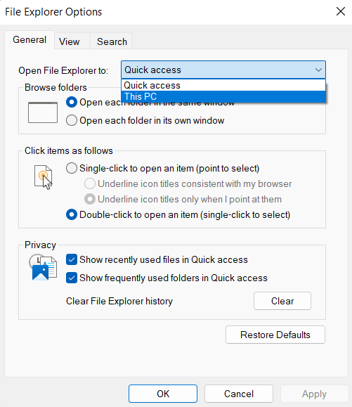 Trinn 2: I den generelle fanen endrer vi alternativet Åpne filutforsker. Uansett hvilket alternativ som er valgt her, endre det til det andre. Hvis den er satt til Rask tilgang, endrer du den til Denne PC-en. Hvis standarden er Denne PC-en, endrer du den til Rask tilgang.