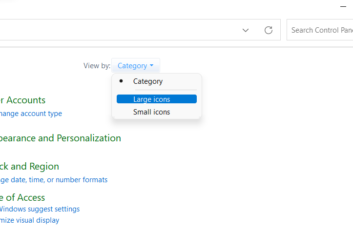 Trinn 1: Åpne Kontrollpanel fra Start-menyen. Endre visningen fraKategoritilStore ikoner.