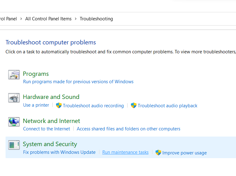 Trinn 3: Klikk på i menyen som åpnesKjør vedlikeholdsoppgaveunderSystem og sikkerhetdel.