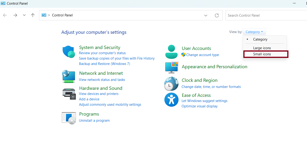 2. Klikk på Kategori og velg "små ikoner".