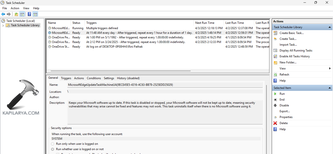 Trinn 5-Der vil den midterste ruten vise en liste over planlagte oppgaver, og den nedre ruten lar deg velge hvilken som helst oppgave for å sjekke egenskapene. Bortsett fra disse, vil Actions vise frem filen som vil kjøre så snart den planlagte oppgaven er aktivert.