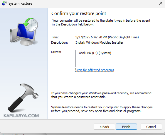 En annen løsning for å løse problemet med ugyldig kommandolinjefeil ved oppstart av Windows 11 er å gjenopprette systemet til tidligere punkter når det ikke oppstod noen feil under oppstart av systemet. Sjekk nå instruksjonene nedenfor for å gjøre det samme.