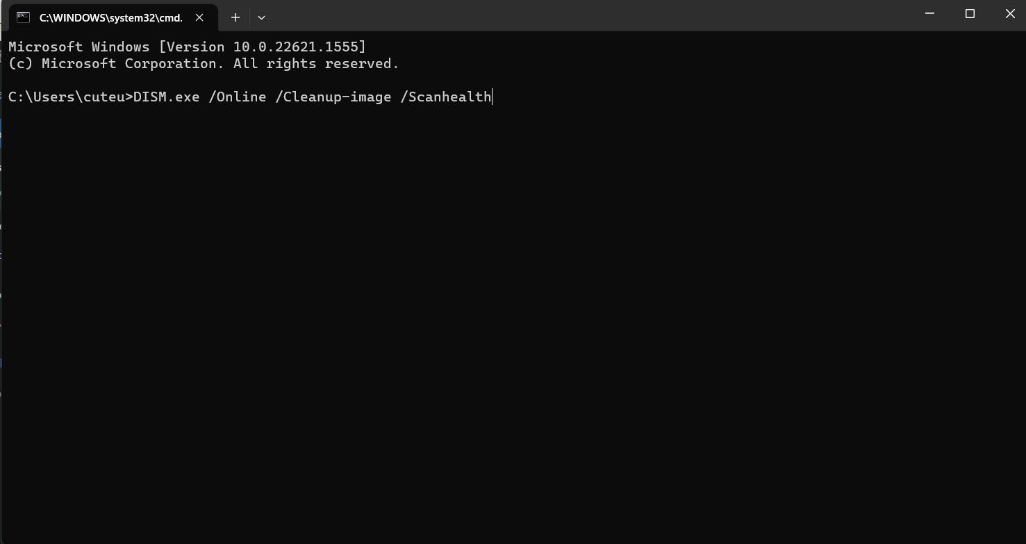 - Skriv kommandoDISM.exe /Online /Cleanup-image /Scanhealthog trefferGå.