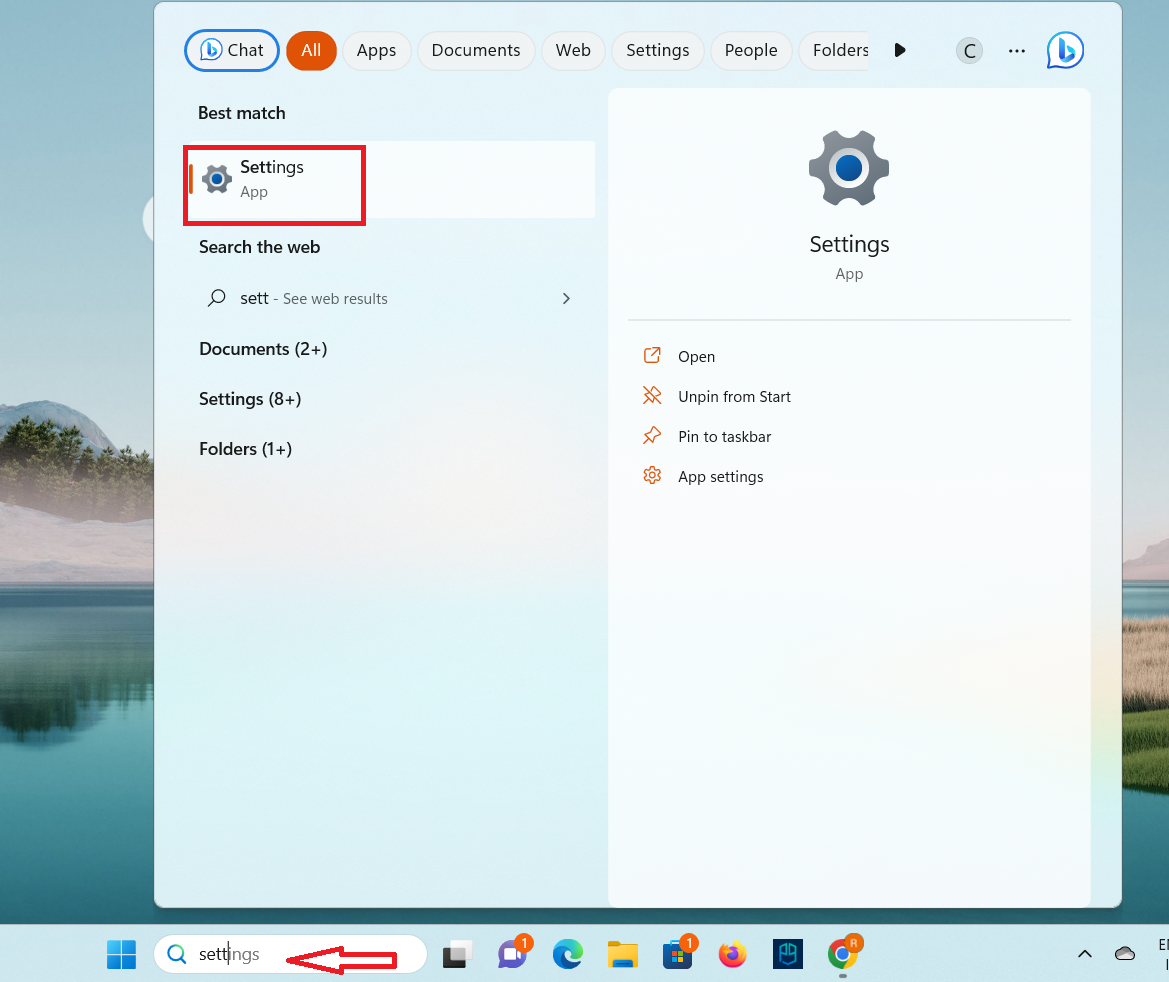 - ÅpneInnstillingerved å trykkeWindows + Inøkler sammen eller søkInnstillingeriSøkgitt i oppgavelinjen.