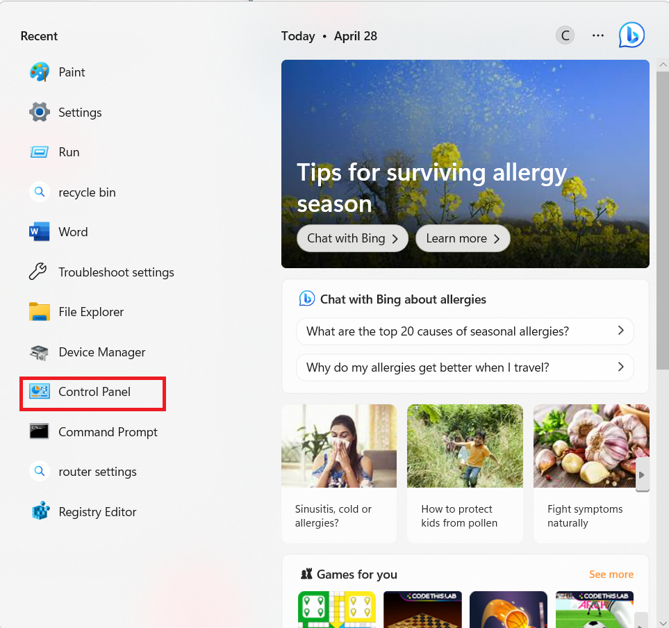 - Trykk påVindu + Qnøklene sammen og åpneKontrollpanelsamme som vi gjorde i forrige reparasjon.