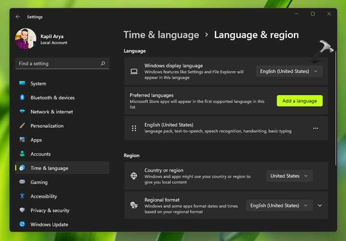 4.Dine regionale innstillinger for Windows 11 må settes til USA. Gå tilInnstillinger > Tid og språk > Språk og regionfor å endre denne innstillingen. Når senere AmazonAppstore er tilgjengelig for alle brukere over hele verden, kan du hoppe over dette trinnet.