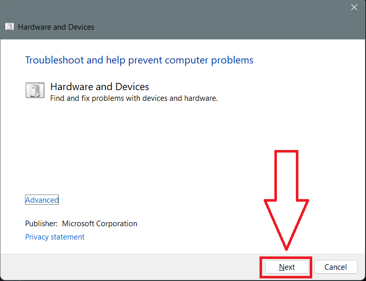 Løsning 1: Ved å kjøre maskinvarefeilsøking