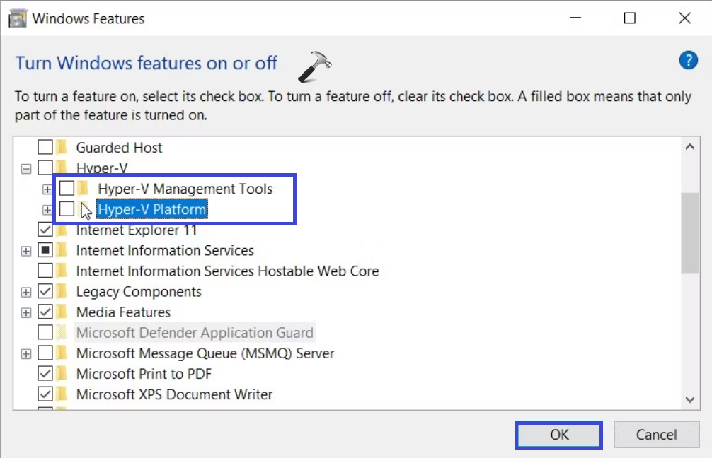 3. Fjern merket for "Hyper-V administrasjonsverktøy"og "Hyper-V-plattformalternativer.