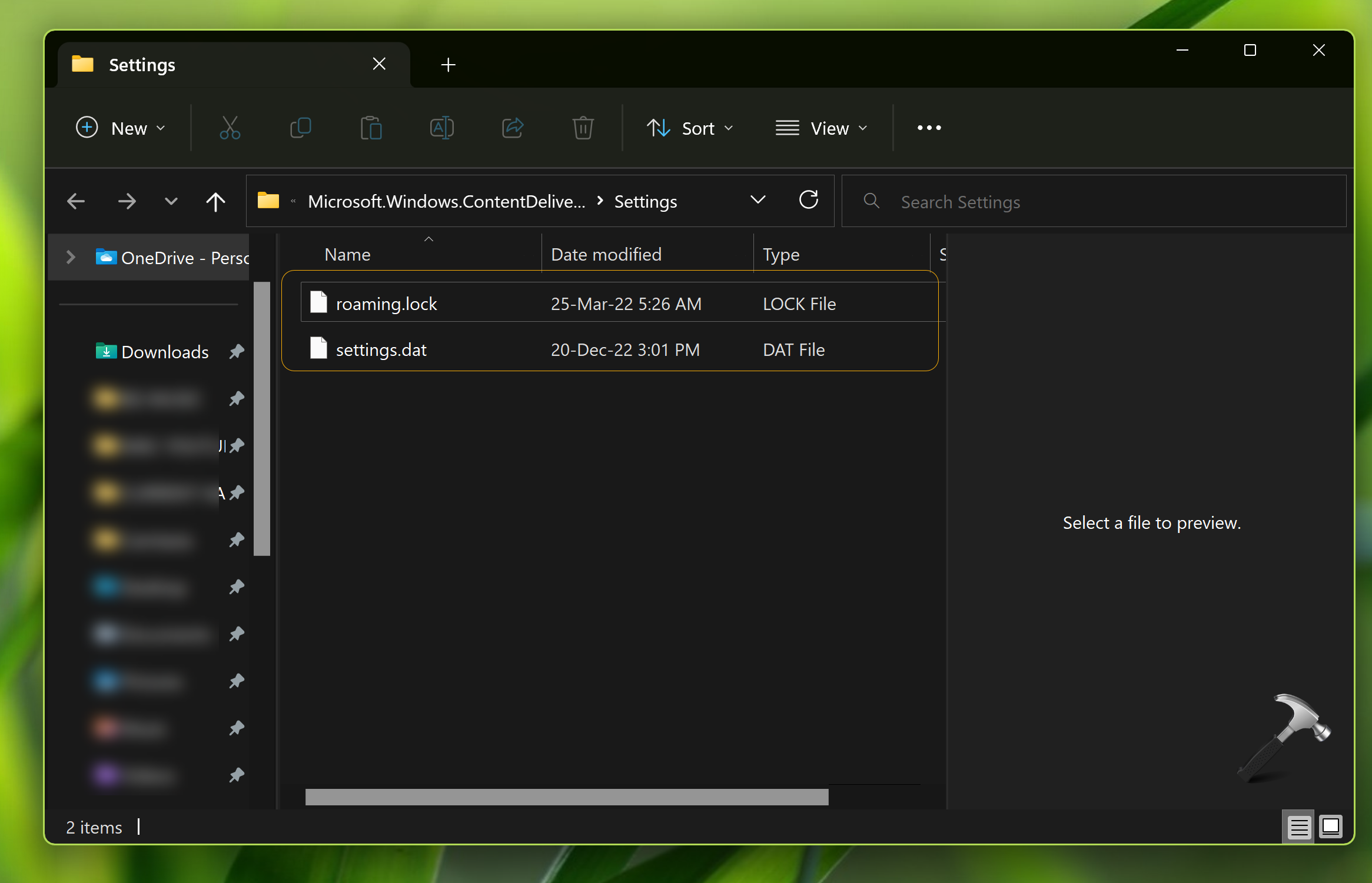 3. I Innstillinger-mappen åpnes neste, finner du to filersettings.datogroaming.lock. Gi nytt navn til disse filene til henholdsvis settings.dat.bak og roaming.lock.bak ved å høyreklikke på hver fil og trykke Gi nytt navn.