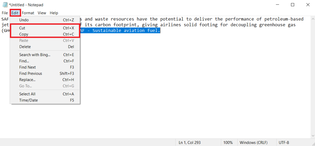 La oss nå diskutere noen av de grunnleggende funksjonene som Notepad tilbyr og som også er ganske nyttige. Klipp ut, Kopier, Lim inn, Velg alle, Finn og Finn og erstatt er noen av disse funksjonene. Vi får se hvordan det fungerer.
