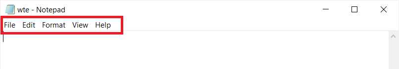 Menylinjene i Notisblokken er:Fil,Redigere,Utsikt,Format, ogHjelp. Hver menylinje har sitt eget sett med alternativer som brukes til å utføre ulike funksjoner i Notepad-programmet.