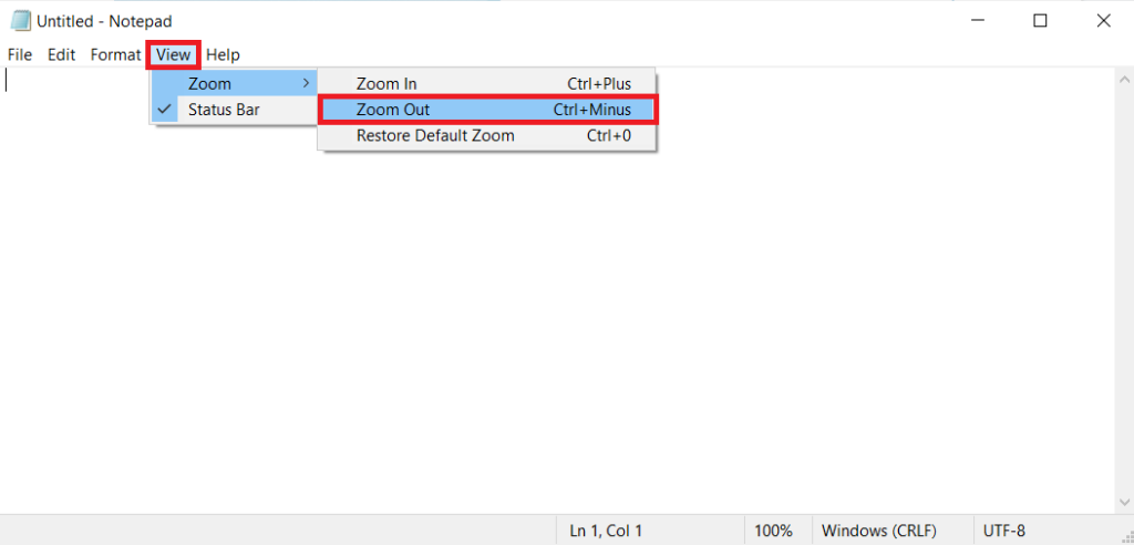 3.Klikk påUtsiktmenylinjen fra Notisblokk-vinduet og velgZoomalternativ. Deretter velger duZoom utfor å redusere størrelsen på teksten din etter behov.