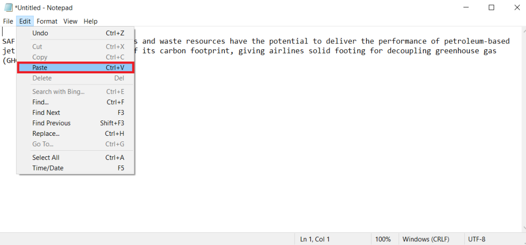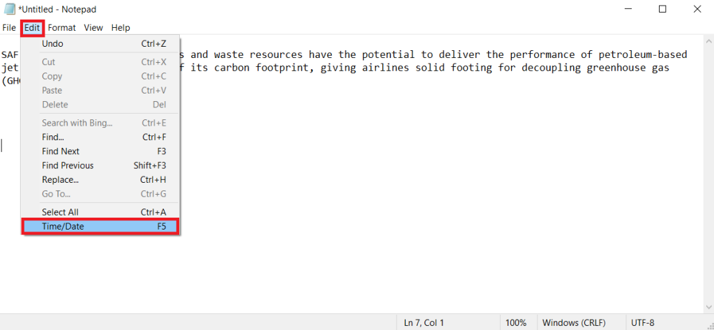 2.Gå til Notisblokk-applikasjonenRedigeremenylinjen og velgTid/datoalternativet fra kontekstmenyen som vist. Alternativt klikker du bare påF5tasten på tastaturet.