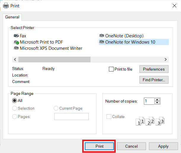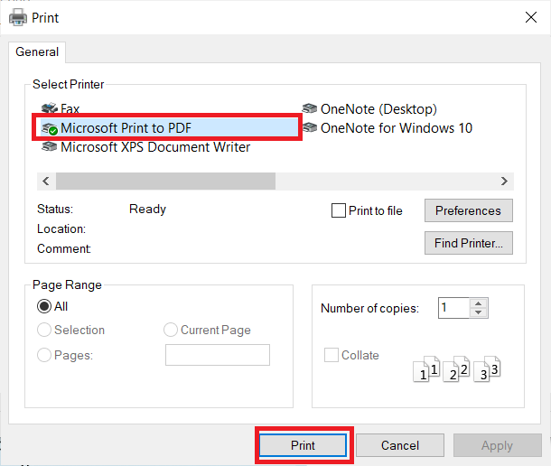 3.PåTrykkvindu, velgMicrosoft Print til PDFalternativet underVelg Skriverog klikk påTrykkknapp.