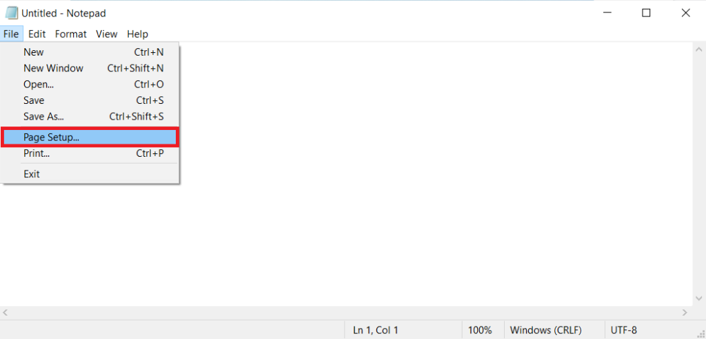 Håper du har lansert Notepad-programmet på PC-en din. Øverst til venstre på Notepad-skjermen finner du menylinjene arrangert på en horisontal måte. Den første er Fil-menyen som inneholder alle de grunnleggende nødvendighetsalternativene somNy,Åpne,Spare,Lagre som,Trykk, osv. La oss se alle én etter én.