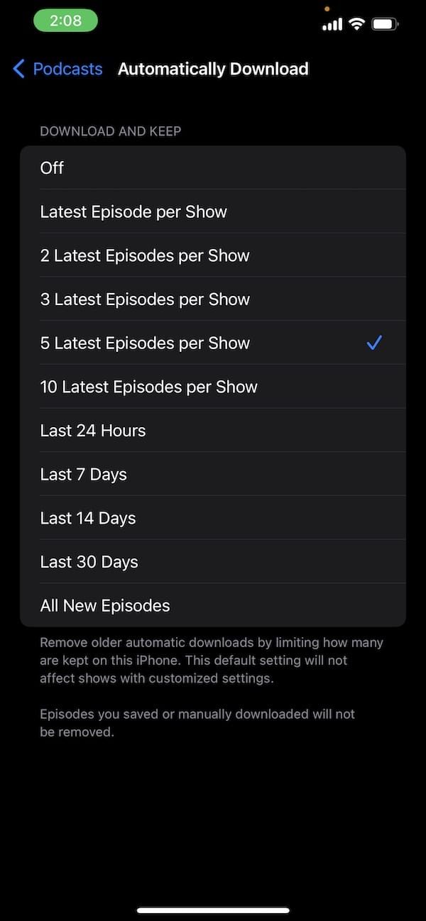Apple har lagt til en ny «automatisk nedlasting»-funksjon som lar brukere konfigurere et «last ned og behold»-alternativ for antall podcaster som kan lastes ned automatisk på en iPhone eller iPad. Eldre podcaster slettes automatisk basert på det valgte alternativet. Denne innstillingen kan endres ved å gå til Innstillinger > Podcaster og er nyttig for brukere med begrenset lagringsplass.