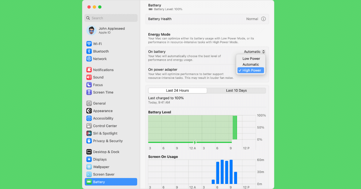 Høyeffektmodus er lett tilgjengelig i energiinnstillingene under Systemvalg. Brukere har fleksibiliteten til å velge mellom automatisk, lav strøm eller høy strøm modus, uavhengig av om enheten kjører på batteri eller er koblet til en strømadapter. Alternativet fungerer som motstykket til Low Power Mode, introdusert i macOS Monterey, for å forlenge batterilevetiden.