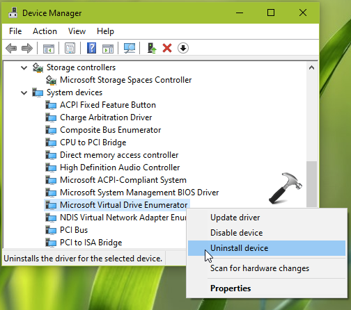 Note:I trinnene nedenfor antas det at Windows er installert på C:. I detteeksempel, har vi vist fremgangsmåten ved å fjerne Microsoft Virtual Drive Enumerator. Du kan bruke lignende trinn på driveren du vil avinstallere.