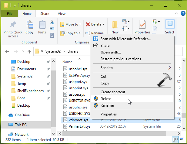 6.Som i trinn 3, fikk vi den faktiske plasseringen av driverfilen. Så vi går tilC:WindowsSystem32driversmappe og fant driveren. Du kan ganske enkelt høyreklikke på driveren og velgeSlett. Hvis du blir bedt omUAC-tillatelser, gi dem til å fullføre operasjonen.