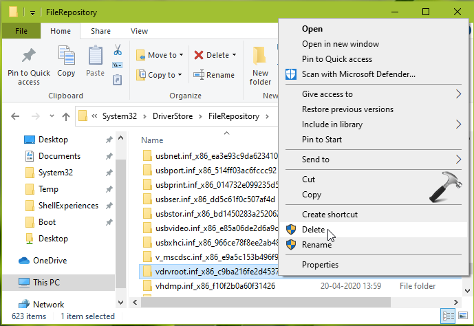 7.Deretter har vi slettet .inf-filen for stasjonen. Så ettersom vi fikk Inf-navnet i trinn 2, bruk det som initialer og ved hjelp av dette, finn driverinf-mappen påC:WindowsSystem32DriverStoreFileRepository. Høyreklikk på mappen for å slette den, gi UAC-tillatelser for å fullføre.