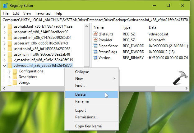 9.Bruk Inf-navnet vi fikk i trinn 2, finn driveren. Du kan klikke på Strings-undernøkkelen til driveren du befinner deg og bekrefte navnet på den tilsvarende høyre ruten. Eksporter nå bare driverens registernøkkel som en sikkerhetskopi. Høyreklikk deretter ogSlettsjåføren. Lukk Registerredigering.
