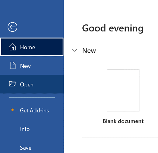 Trinn 1:Åpne et nytt Microsoft Word-dokument og klikk påFilalternativet fra øverste venstre hjørne av dokumentet.