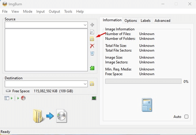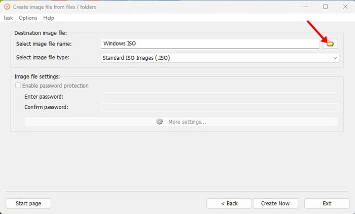 Trinn 7:Gå nå til Destinasjonsbildefilområdet, og klikk på Mappe-alternativet. Bestem hvor du vil lagre ISO-bildefilen nå.