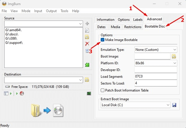 Trinn 6:Gå tilAvansert > Oppstartbar disknå.Gjør bildet oppstartbartbør velges.