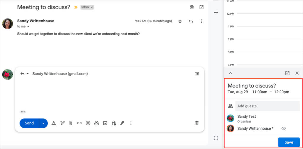 Enten du oppretter arrangementet ditt fra en e-post du skriver eller svarer en mottaker med tilgjengelige tider, gjør integrasjonen med Gmail og Google Kalender det enkelt å planlegge.