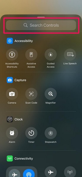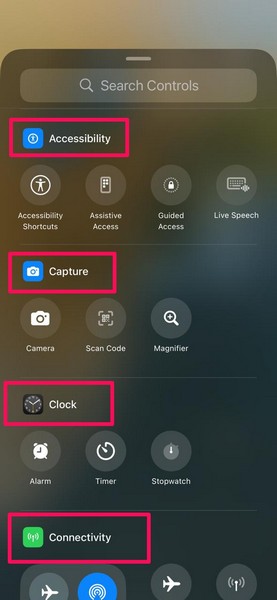 4.Nå,bla gjennom de forhåndsinnstilte kontrolleneoppført på følgende Legg til en kontroll-side ved å bla opp eller ned. Du vil finne forskjellige nye kontrollalternativer oppført under dedikerte seksjoner somTilgjengelighet,Fangst,Klokke,Tilkobling,Skjerm og lysstyrke, og mange flere.