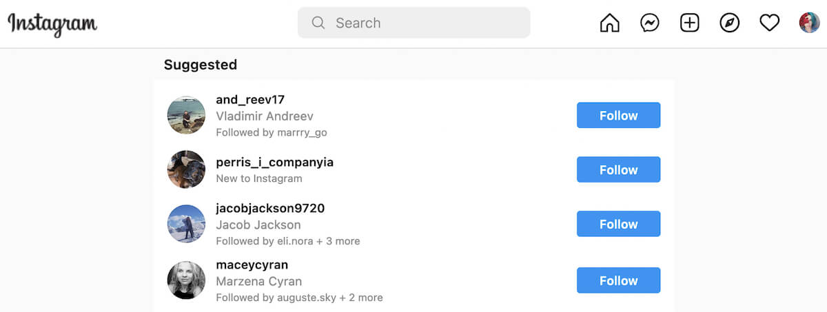 For å se hele listen over anbefalte profiler, gå til Instagram-nettstedet, finnForslag til degunder profilbildet ditt på hjemmesiden, og velgSe alleved siden av.