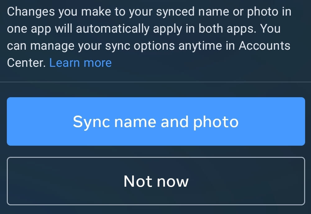 - I neste trinn vil Meta be deg om detSynkroniser navnet ditt og profilbildet ditt. Dette betyr at endring av navn eller profilbilde på et av nettverkene vil automatisk endre det på det andre. Du kan velgeSynkroniser navn og bildeellerIkke nå.