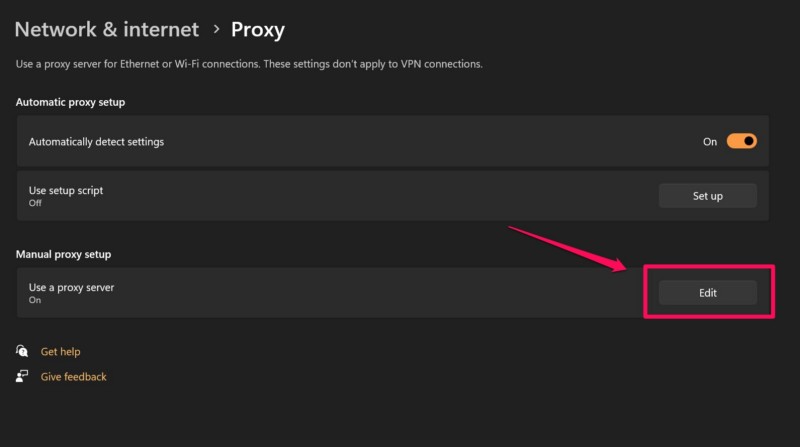 4.Hvis du har en manuell proxy-server satt opp, klikker du påRediger-knappved siden avBruk et proxy-serveralternativunderSeksjon for manuell proxy-oppsett.