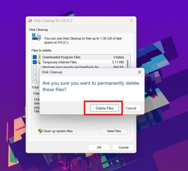 6. Bekreft handlingenpå følgende ledetekst og vent til Diskopprydding-verktøyet fjerner de midlertidige filene.