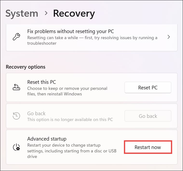 1.For å aktivere CSM-alternativet i datamaskinens BIOS-innstillinger, gå inn i Windows Recovery Environment (WinRE). For å gå inn i WinRE, gå tilBedringdelen avInnstillingsprogramog klikk deretter påStart på nytt nåknappen ved siden avAvansert oppstarttekst.
