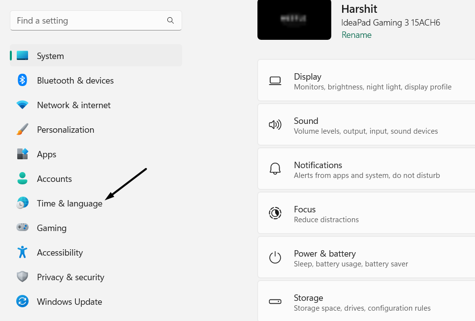 1.StartInnstillinger-appenpå systemet ditt og velgTid og språkfra venstre sidefelt i den.