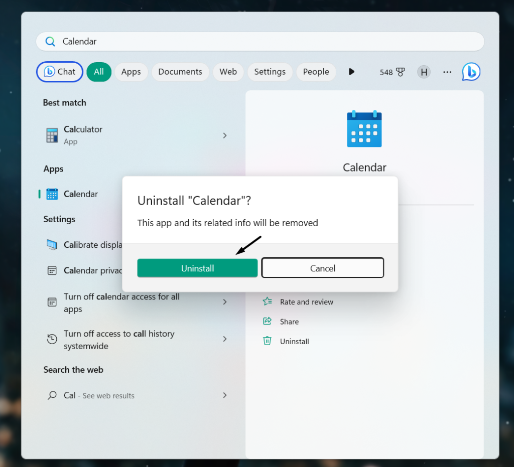 2.I Windows-søkeresultatene klikker du påAvinstallerknappen underKalenderprogram.
