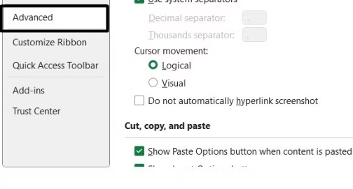 2.IExcel-alternativervindu, fortsett tilAvansertfanen fra venstre navigasjonsmeny.