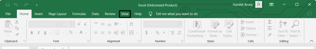 1.IMicrosoft Excel-appen, fortsett tilUtsiktdelen fra den øverste navigasjonsmenyen.