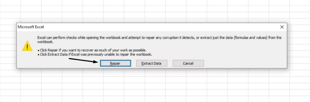 3.IMicrosoft Excelvindu, klikk påReparerealternativet for å begynne å reparere den ødelagte filen.