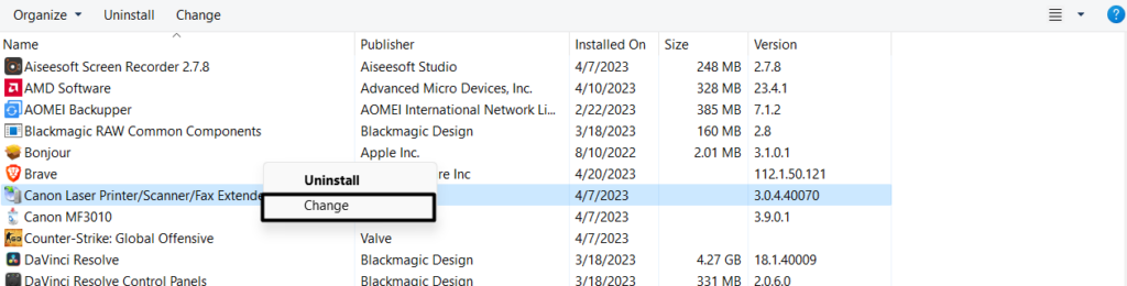 3.Se etterMicrosoft Office-appen, høyreklikk den og velgEndrefra den nye popupen.