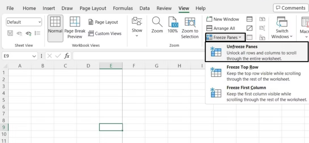 2.IUtsiktseksjon, klikkFrys ruter, og velg fra rullegardinmenyenFrigjør ruter.
