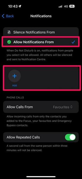Som standard er Ikke forstyrr-modusen på iPhone satt til å omgå anrop og varsler fra kontakter på favorittlisten din. Så hvis noen fra din favorittliste over kontakter ringer eller sender en melding på din iPhone, vil du motta varslene selv med Ikke forstyrr-modus slått på.