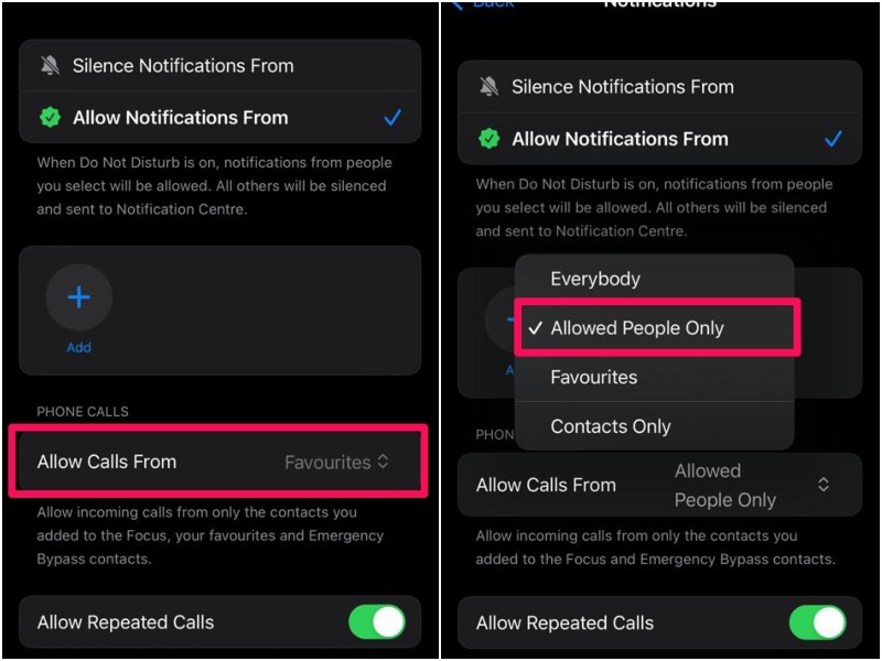 6.Deretter trykker du påTillat anrop fraalternativet under Telefonsamtaler-delen og bytt det fraFavorittertilKun tillatte personer. Nå, siden det ikke er noen kontakt i Tillat varsler fra-listen, vil du ikke motta varsler fra noen kontakt eller person på iPhone.